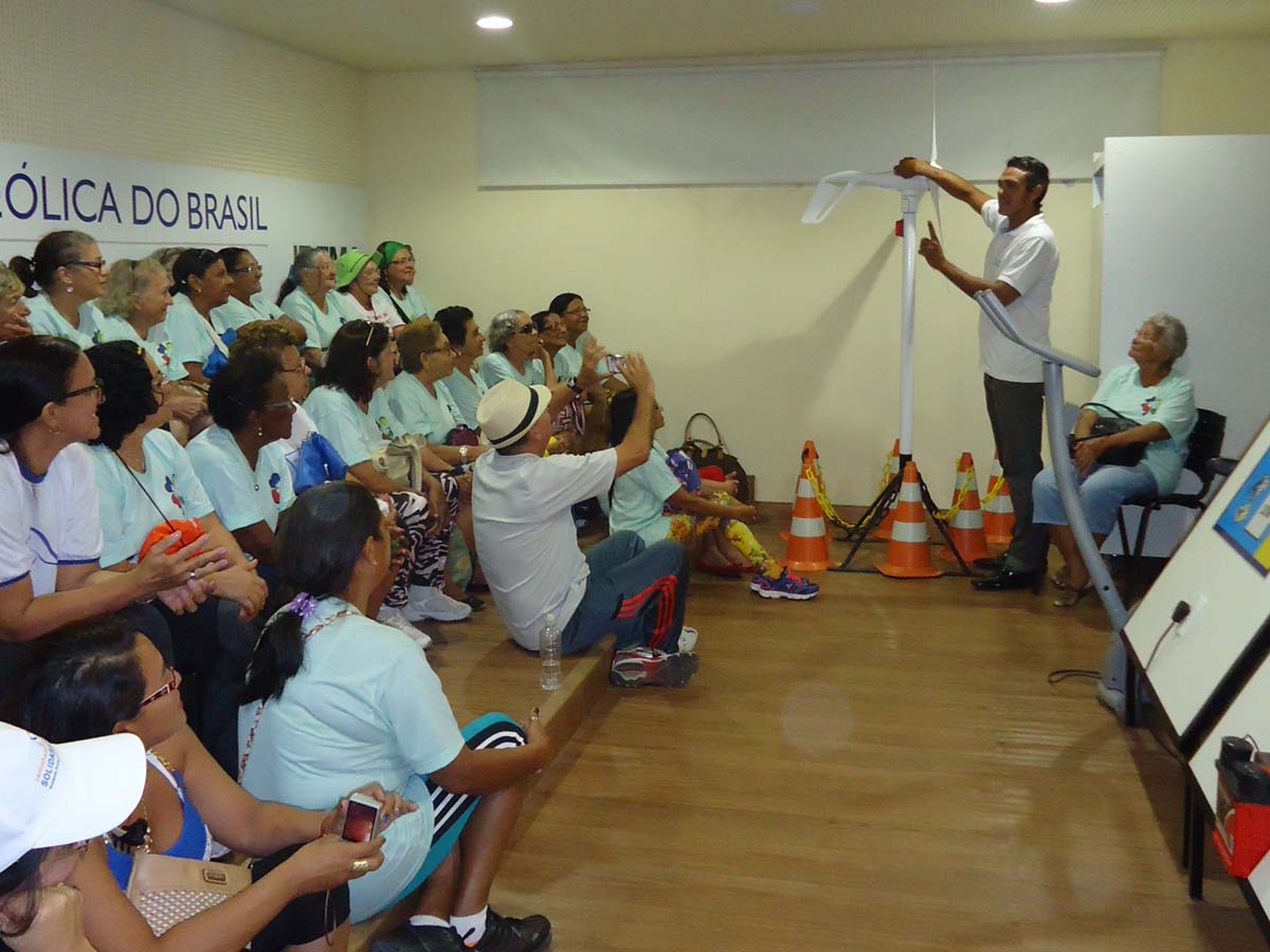 Os visitantes parabenizam o Projeto Aulas de Energia e agradecem pelas informações transmitidas sobre eficiência energética e energias renováveis . Na sala de maquetes, todos interagem sobre as energias renováveis, formando uma roda de ideias.